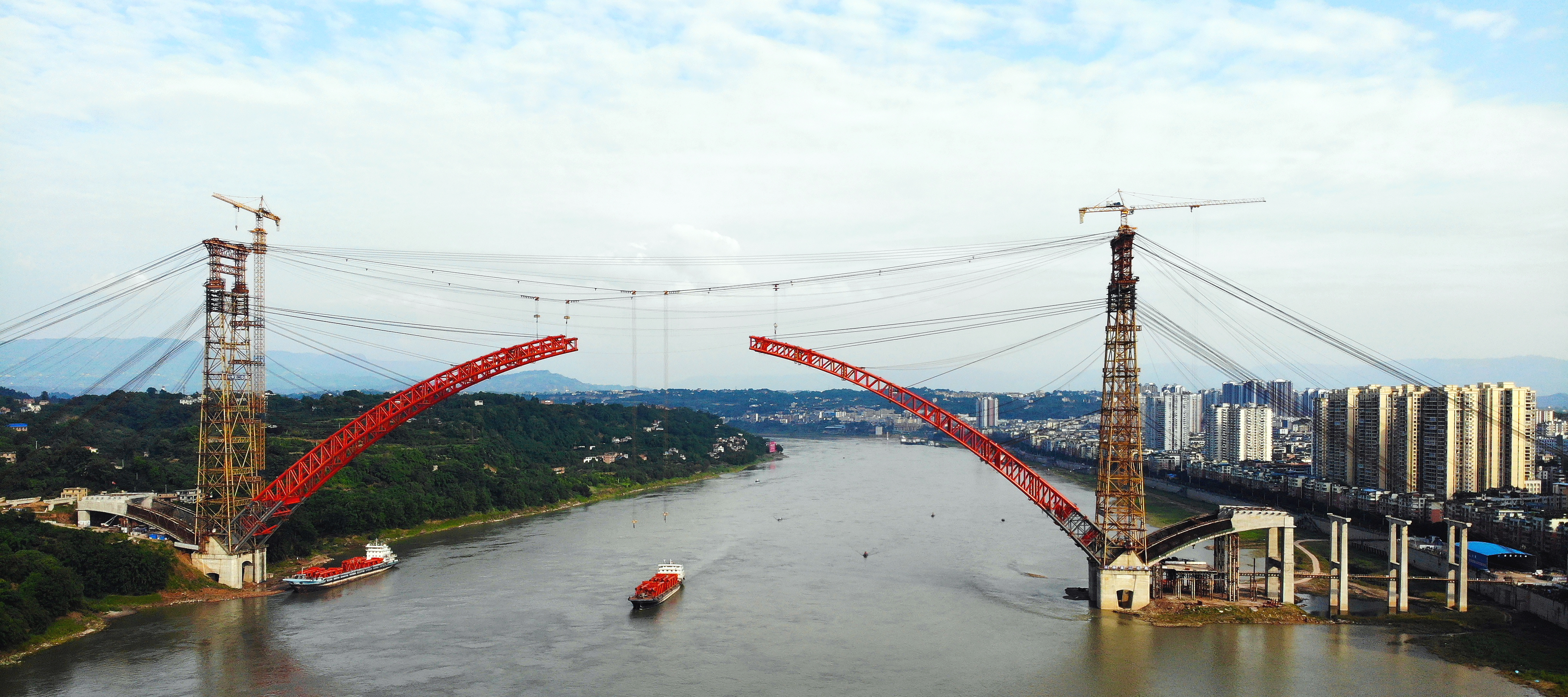 四川合江长江公路大桥是合江县第一座地方长江公路大桥,也是四川渡口改为桥梁的代表工程,建成后将为合江县城区南北两岸的提供便捷过江通道。该桥由四川省公路规划勘察设计研究院有限公司设计,中交第二公路工程局有限公司施工,四川交通职业技术学院参与部分科研工作。本作品拍摄于四川合江长江公路大桥的主拱封胶施工阶段,展示了该桥关键施工过程,体现了钢管混凝土拱桥与环境的协调、和谐之美。